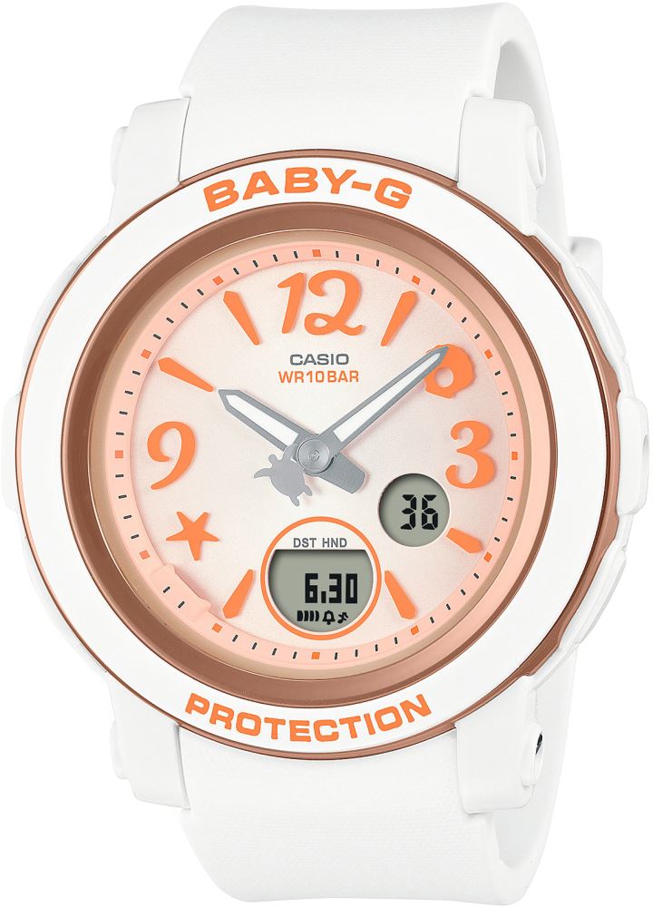 Yuvarlak kadranlı BGA-290US-4A, tropik denizlerin canlı renkleriyle bezendi. Çerçeve halkasına uygulanan buhar biriktirme kaplaması, mat yüzeye ışıltılı bir vurgu katarak, bileğinize renkli bir plaj tarzı getirir.