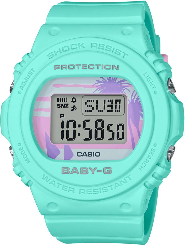 BABY-G’nin tasarladığı 80’lerin ABD batı yakasını anımsatan görünümlerle beğeniye sunulan saat modelleri, zarif ve canlı duruşlarıyla dikkatleri çekiyor. 80’li yıllarda popüler olan pastel tondaki su yeşili renginin kullanıldığı BGD-570BC-3, kadranındaki palmiye ağacı ve plaj görüntüleriyle zamanın ruhunu yansıtıyor.