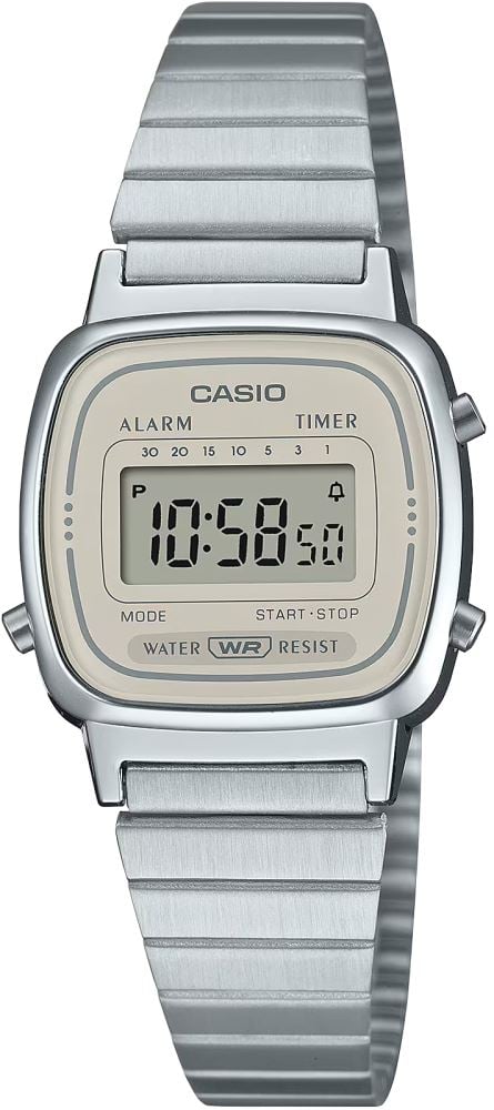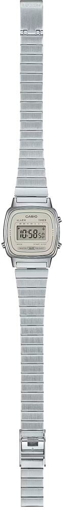 En çok tercih edilen Vintage modellerden biri olan Casio LA670WEA-8AEF, şık, dayanıklı ve klasik bir tasarım sunuyor. Gri-krem kasası, paslanmaz çelikten yapılmış kayışı ile her ortama uyum sağlayabilir bir şıklığa sahip. Suya karşı olan dayanıklığı ve yaklaşık 2 yılık pil ömrü ile rahat bir kullanım sunuyor. Ayarlanabilir tokalı kayışı ile bileğinize kolayca uyum sağlar.