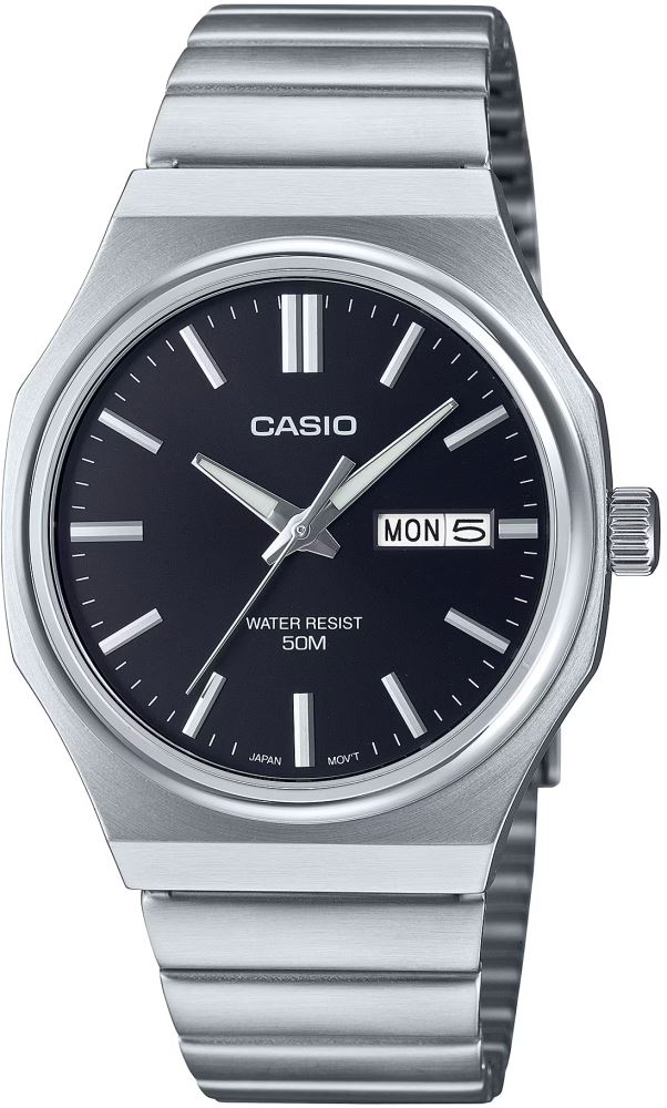 Cesur ve sade bir stil için, metal sekizgen kasaya sahip, gri kadran ve siyah çelik kordonla tasarlanmış klasik bir analog saat MTP-E735D-1AVDF.