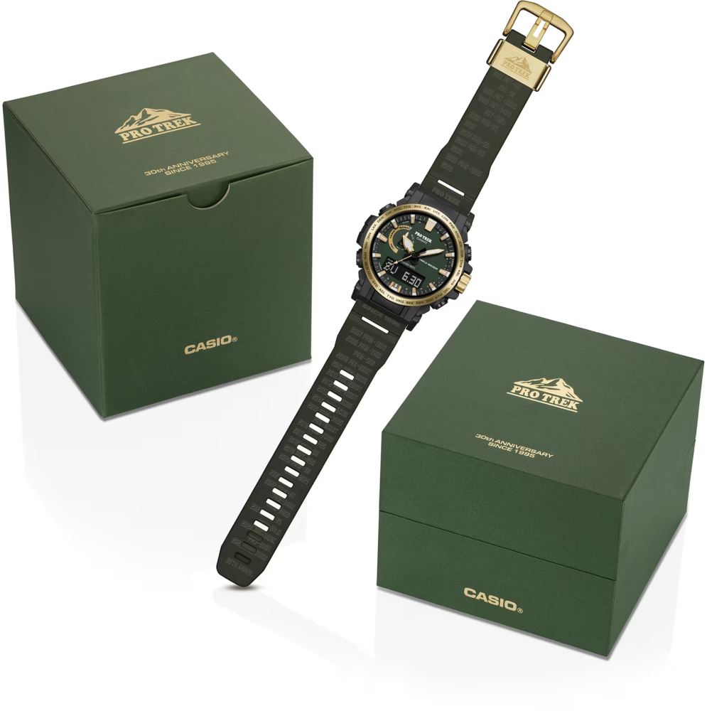 Bu yıl dönümüne özel tasarlanan model, doğanın sakinleştirici yeşil tonlarını güneş ışığının altın parıltısıyla birleştiren özel bir renk paleti sunuyor. Ağaçların arasından süzülen ışık hissini yansıtan bu estetik, PRO TREK’in “Doğa ile Bütün” anlayışını güçlü bir biçimde öne çıkarıyor. Altın iyon kaplamalı kordon halkası, kayış üzerindeki sıcak damga tekniğiyle işlenmiş ikonik eski model isimleri, arka kapakta yer alan 30. yıl logosu ve diğer özel detaylar, PRW-61ANS-3DR’yi gerçek bir koleksiyon parçasına dönüştürüyor.