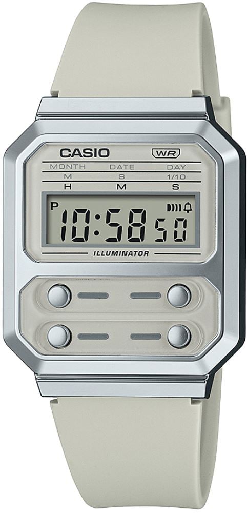 Reçine kasa ile tasarlanan ilk Casio saat olan F-100'e saygı duruşunda bulunan A-100 serisi, ikonik dört ön düğmeye tasarımında yine yer verirken, vintage tarzı metalik bileşenler ekleyerek farklı bir yorum katıyor.