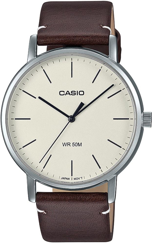 Analog erkek saatlerinde ön plana çıkan Casio MTP-E171L-5EV kol saati, kahve deri kordon ve beyaz kadran tasarımı ile maksimum dayanıklılık sağlıyor. Klasik saat stilini yenilikçi tasarım anlayışıyla bir araya getiren model bu anlamda geniş kullanıcı kitlesine hitap ediyor.