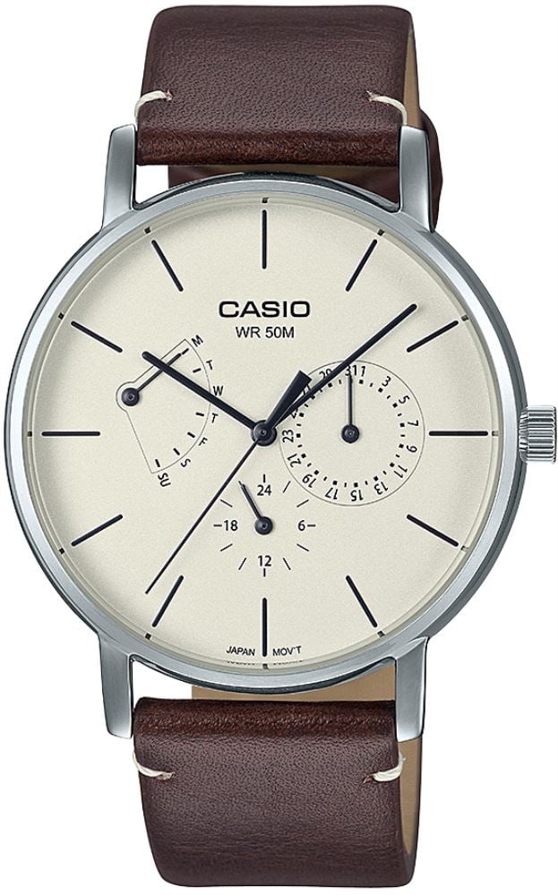 Casio MTP-E320L-5EVDF kol saati, kahverengi deri kordonu sayesinde oldukça spor bir tasarıma sahiptir.