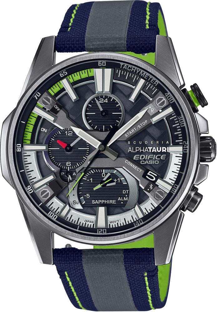 Scuderia AlphaTauri yarış arabasının tabanında ve kanatlarında kullanılan 6000 karbon fiberden üretilen EQB-1200AT, en son motor sporları teknolojisini bileğinize taşıyor. Teknisyenlerin pist güvenliği için kullandığı renk olan floresan sarı, temel bileşenleri vurgulayarak her saniyeyi en iyi şekilde değerlendirmesi gereken yarış takımlarının ihtiyaç duyduğu yüksek görünürlüğü sunar. Sarı saniye göstergesi ve son derece hassas Akıllı Telefon Bağlantısı, saniyesi saniyesine dakik kalmanızı sağlar.