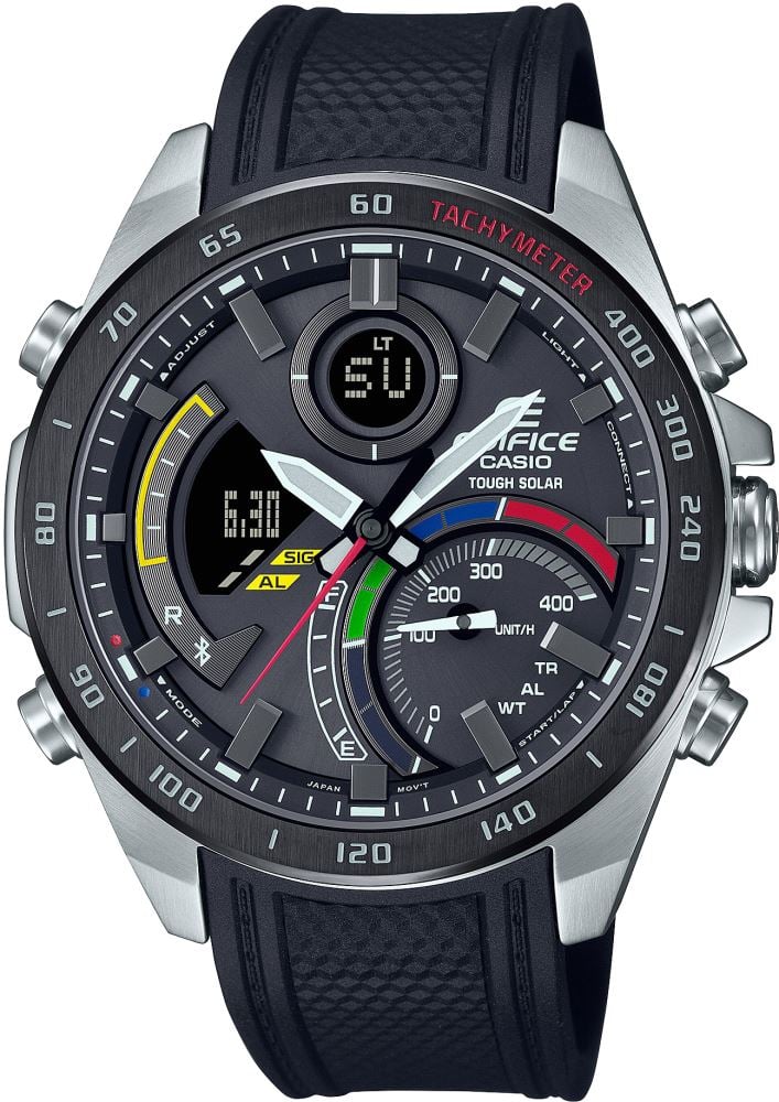 Bu yeni Edifice'in kadranı, yarış arabası direksiyonlarının düzeninden ilham alan renkli dokunuşlarla tasarlandı. Saniye ibresi ve diğer renk kodlu bileşenler ise, yarış ekiplerinin anlık kararlar ve hızlı eylem için ihtiyaç duyduğu olağanüstü görünürlüğü sağlamak için geliştirildi. Yumuşak üretan bant, son derece rahat bir uyum sunarak, sizi daha heyecan verici şeylere odaklanma özgürlüğüne kavuşturmak için üstün Japon teknolojisiyle geliştirildi.