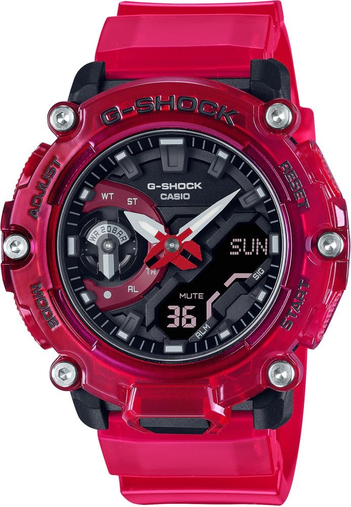 Dans pistinde akan bir ses dalgalanmasından ilham alan bu saat, analog ibreler ve dijital ekrana sahip sportif GA-2200'ün stereofonik bir yorumu için bu vizyonu, renk ve tasarıma dönüştürüyor.