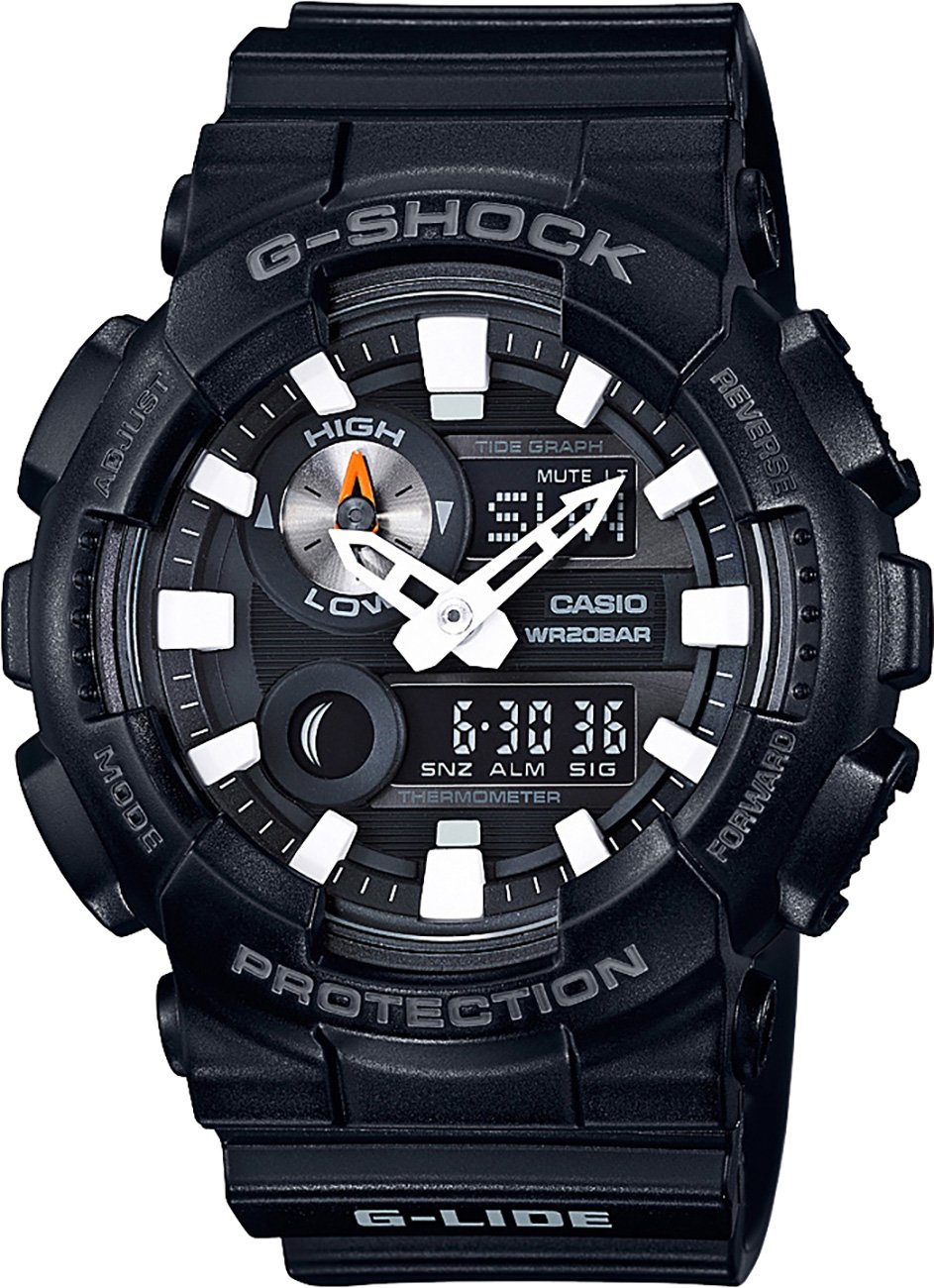 Dünyaca ünlü saat markasının en sevilen saat serilerinden olan G-SHOCK G-LIDE, sörfçülerin ve sokak sporcularının favori kol saatleri arasında yer alıyor. Dünyanın en iyi sörfçülerinin ve sokak sporcularının gözdesi olan saatler içinde en sık tercih edilenlerden biri de GAX-100B-1A modeli. Temel rengi siyah olarak tasarlanan kol saatinin kadranı gümüş rengin yansımasına sahip. Hem analog hem de dijital formatların en iyi özelliklerini bir arada sunuyor. Büyük saat işaretleri, akrep ve yelkovan saatin kolay bir şekilde okunmasını sağlıyor. Ok şekline sahip yelkovan ve kolların zıt renkleri, spor esnasında ekranın tek bakışta okunmasına imkan tanıyor.