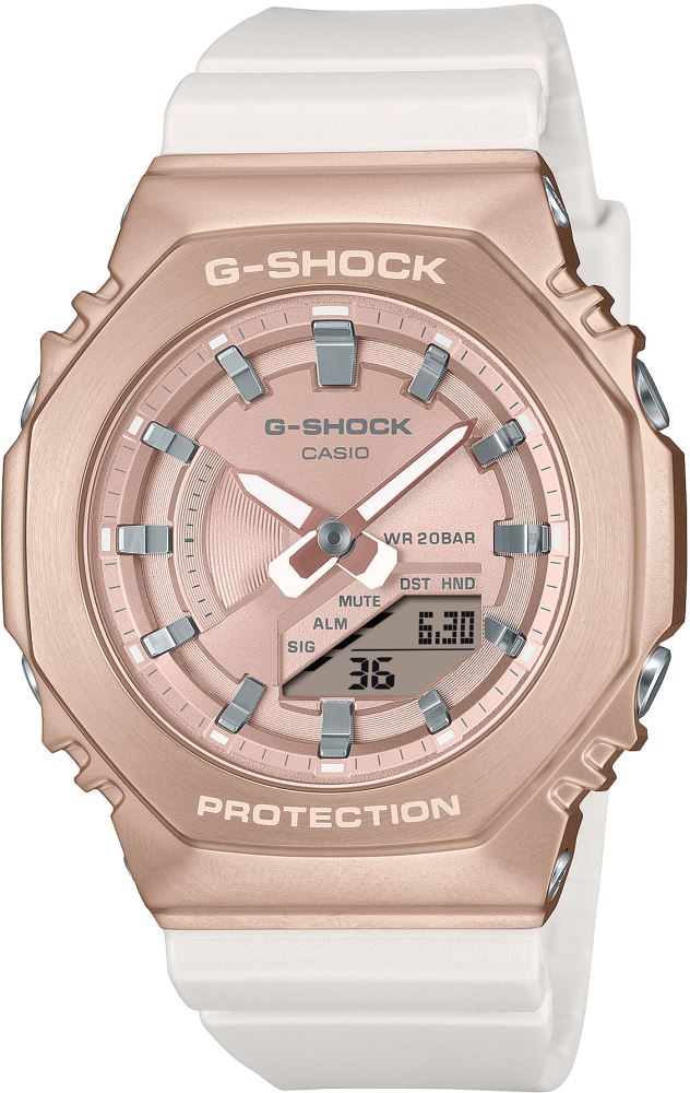 Metal kaplı GM-2100'ün daha kompakt versiyonu olan GM-S2100CW-7ADR, zarif ve sofistike bir görünüm sunmak için şeftali-altın rengi iyon kaplamalı çerçeve, göstergeler ve kadranla tamamlandı.