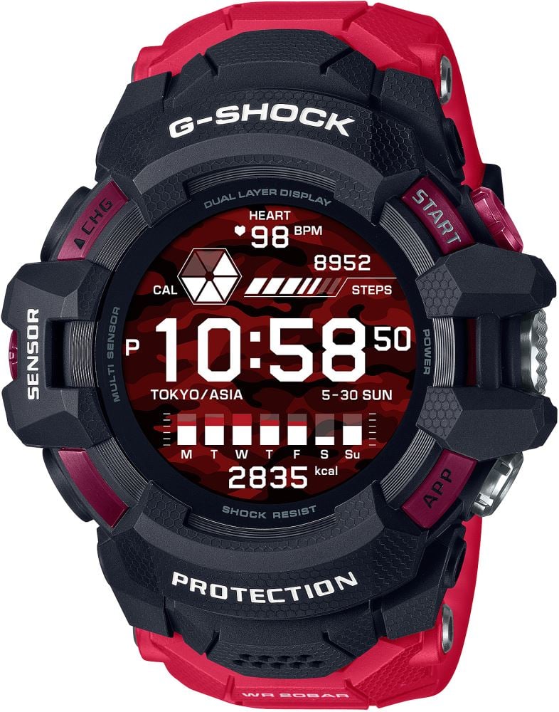 Casio G-Shock serisinden G-Squard Pro GSW-H1000-1A4, 200 metre derinliğe kadar su geçirmez bir saat modelidir. Özellikle spor yapanların tercih ettiği akıllı saat, Google ile desteklenir ve G-SHOCK MOVE uygulaması ile eşleşerek saat ve antrenman kurulumlarını kolaylıkla yapmanızı sağlar. Sağlam kasası dış darbelere karşı koruma sağlar ve günlük basit egzersizlerden daha zorlayıcı sporlara kadar her hareketinizde foknsiyonel bir kullanım sağlar. Güçlü GPS sinyalleri alabilen GSW-H1000-1A4; mesafe, tempo, hız, yakılan kalori, rota gibi verileri ölçmek için konum bilgilerini kullanır. Böylece antrenman sırasında kaydetmeniz gereken nabız gibi veriler için beş farklı sensör kullanır. Jirometre, yön, yükseklik/basınç, ivme ve optik sensörleri bulunan akıllı saat spor yaparken ihtiyaç duyabileceğiniz tüm bilgileri hafızasına alır. Aynı zamanda bu verileri daha ayrıntılı inceleyebilmeniz için orijinal bir telefon uygulaması ile senkronize çalışır. İşlem yapmak istediğiniz tüm uygulamaları saat ekranında net bir şekilde görebilir ve tercihlerinize göre kişiselleştirebilirsiniz. Akıllı saatin bir diğer özelliği olan sensör katmanı, spor esnasında saat tarafından toplanan verileri ve bu süreçte çekilen fotoğrafları bir araya getirerek videolar ve filmler oluşturur. Çevrimdışı harita kullanma özelliği maksimum 5 konumu kaydeder ve bağlantının mümkün olmadığı yerlerde bile rotanızı güvenle takip edebilmenizi sağlar. Titreşim ve kablosuz bağlantı kurmak için Bluetooth özelliği bulunan GSW-H1000-1A4 model akıllı saatte mikrofon da mevcuttur. Güç için kullanılan lityum iyon piller yalnızca Casio destek merkezleri tarafından değiştirilebilir olup kullanıcılar tarafından değiştirilmesi mümkün değildir. Şarj edilerek kullanılan akıllı saatin şarj süresi yaklaşık 3 saattir ve tam dolum sağlandığında kullanım durumu ve moduna göre 1.5-2 saat dayanabilir. Adım sayısı gibi basit verileri kaydetmenin yanında hobilerinize uygun özel işlemler de yapabilirsiniz. Örneğin balıkçılıkla ilgilenen biri iseniz ay saati açısına göre gelgit grafiğini ve balık zamanını öğrenebilirsiniz. Fonksiyonel kullanım olanaklarının yanında, şık tasarımı ve tarzınıza uygun renk seçenekleri ile de dikkat çeken saat, tek renkli ya da renkli LCD ekranı ile oldukça etkileyici bir görünüme sahiptir. Kırmızı, lacivert ve siyah renk seçenekleri bulunan modelin kadran ve kordonu renk uyumu içinde dizayn edilmiştir.
