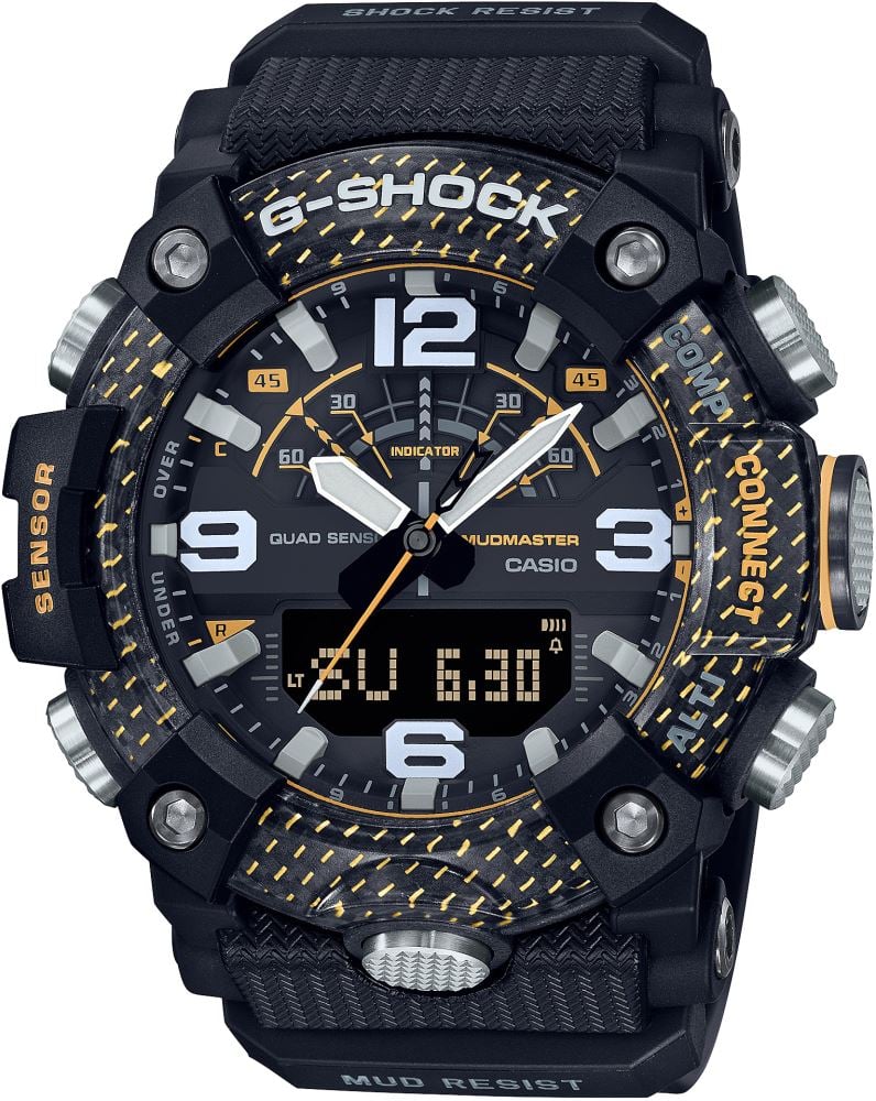 GG-B100 MUDMASTER koleksiyonunun kasasında, hasarı ve bükülmeyi uzak tutmak ve aşırı hava geçirmezlik ve şok direnci sağlamak için, yüksek sertlikte karbon kullanılmıştır. Bu saat aynı zamanda kire karşı koruma sağlayan bir filtreye, paslanmaz çelik bir arka panele ve cam elyafı ile gömülü darbeye dayanıklı ince reçineden yapılmış bir arka kapağa sahiptir ve bu da toza ve çamura karşı yüksek düzeyde direnç sağlar. Çerçevede, karbon fiber eklere sahip üç kat ince reçine kullanılmıştır. Ayrıca pratik ve fonksiyonel bu saat, dijital pusula, altimetre/barometre, termometre ve adım sayacı ile de donatılmıştır.