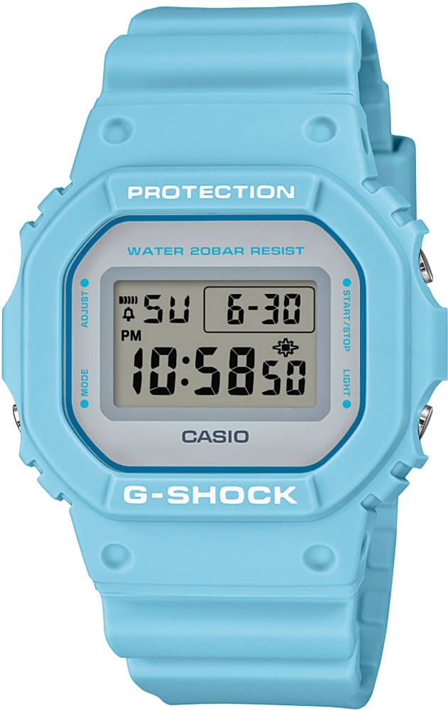 200 m derinliğe kadar su geçirmeyen G-SHOCK DW-5600SC-2’yi, hayatın her anında kullanabilirsiniz. 53 gr ağırlığındaki ürün, yumuşak silikon yapısıyla bileğinizi rahatsız etmiyor. Fütüristik çizgilerle zenginleştirilen tasarım, pastel tonların yumuşak geçişiyle hareketlendiriliyor.