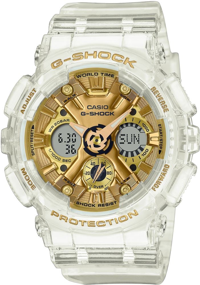Yaz günü gibi parlayan etkileyici G-SHOCK ile stilinizi yenileyin. Parlak metalik buhar kaplaması sayesinde saf altın renginde parlayan kadran, şeffaf kordonun üzerinde şık bir altın aksesuar gibi parlayarak tasarımı tamamlıyor.