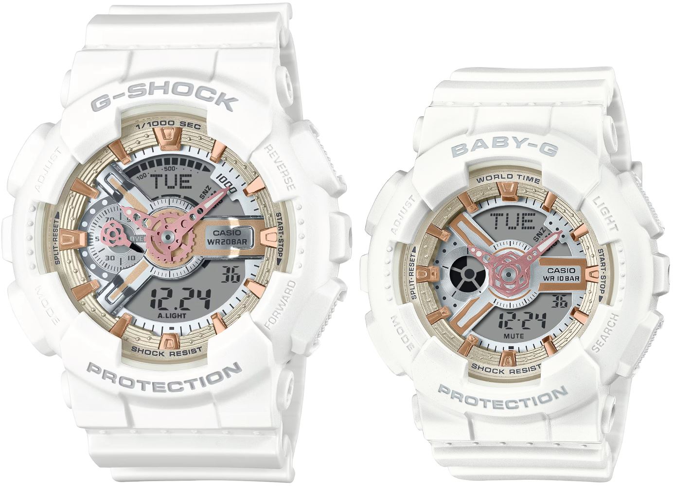 Başlangıç olarak, popüler analog-dijital GA-110 G-SHOCK ve BA-110 BABY-G modellerini seçtik ve onları, paylaşılmış aşkı simgeleyen beyaz-gül motifiyle süsledik.